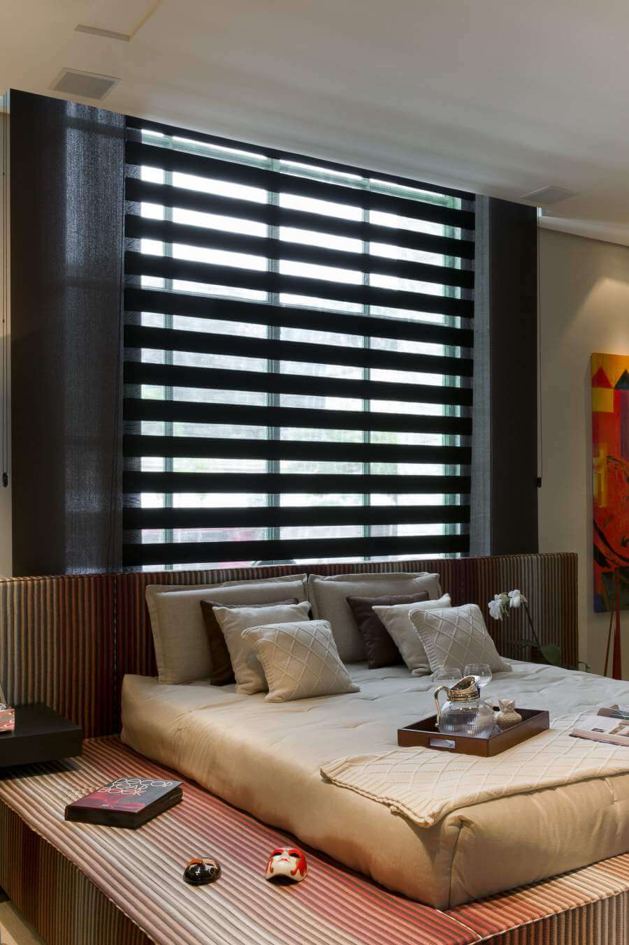 É possível eliminar a entrada de luz quando as cortinas rolo tela solar são utilizadas com tecido Blackout. Também é possível ter o total controle da luminosidade por meio do acionamento motorizado ou manual das cortinas rolo tela solar.