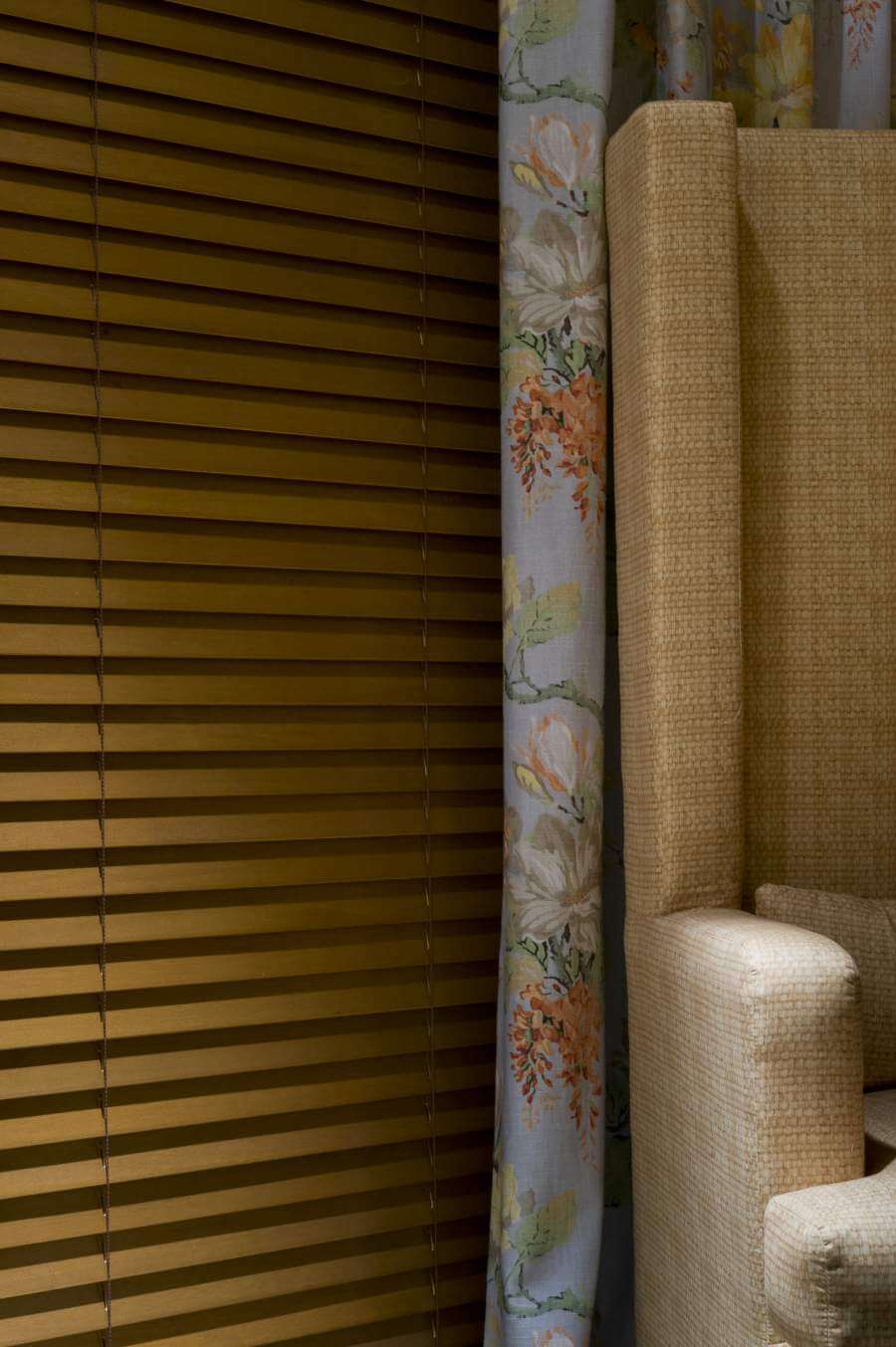 Persiana horizontal de madeira e papéis de parede.
